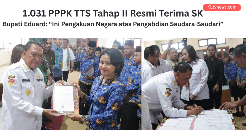 SoE, KLtvnews.com – Langit pagi di atas Kota SoE tampak cerah ketika aula Mutis Kantor Bupati Timor Tengah Selatan (TTS) dipenuhi wajah-wajah haru dan bangga. Rabu (22/10/2025) menjadi hari bersejarah bagi sedikitnya 1.031 Pegawai Pemerintah dengan Perjanjian Kerja (PPPK) Tahap II di Kabupaten TTS yang resmi menerima Surat Keputusan (SK) pengangkatan. Momentum sakral itu juga dirangkai dengan penyerahan SK bagi Calon Pegawai Negeri Sipil (CPNS) lulusan IPDN, menandai babak baru perjalanan birokrasi daerah menuju pelayanan publik yang lebih profesional dan berintegritas.