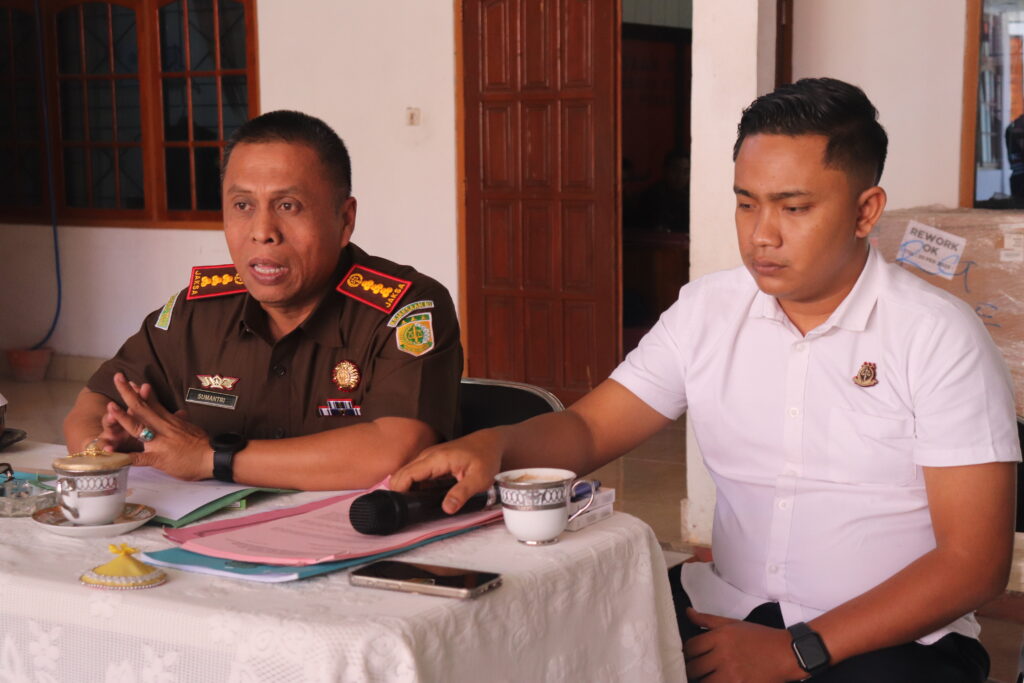 Jelaskan : Kepala Kejaksaan Negeri SoE, Sumantri SH, didampingi Kasie Pidsus Imam M. Cakra,SH.,MH menjelaskan penanganan kasus dugaan Korupsi Dana Desa Desa Supul Tahun 2021 – 2023 kepada belasan warga desa Supul di kantor Kejaksaan Kab. TTS Kamis, 17 Juli 2025 (Foto/Polce/KLtvnews.com)